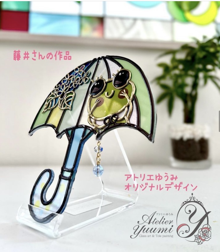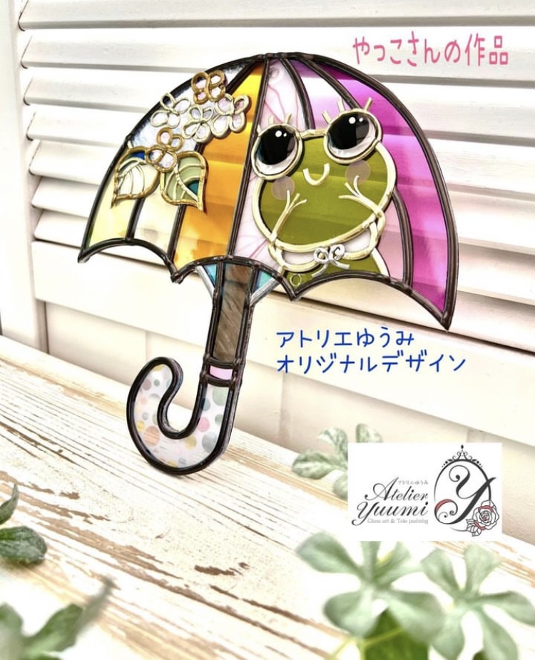 梅雨の季節にぴったりのかえるのパラソルの作品です。アトリエゆうみオリジナルデザインです。
