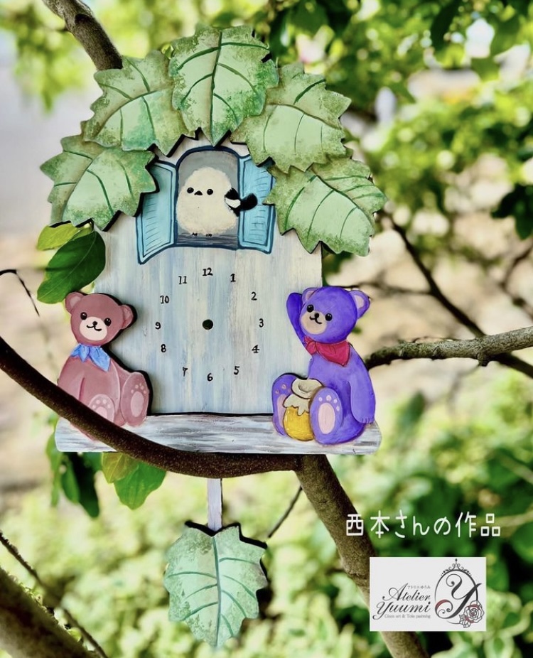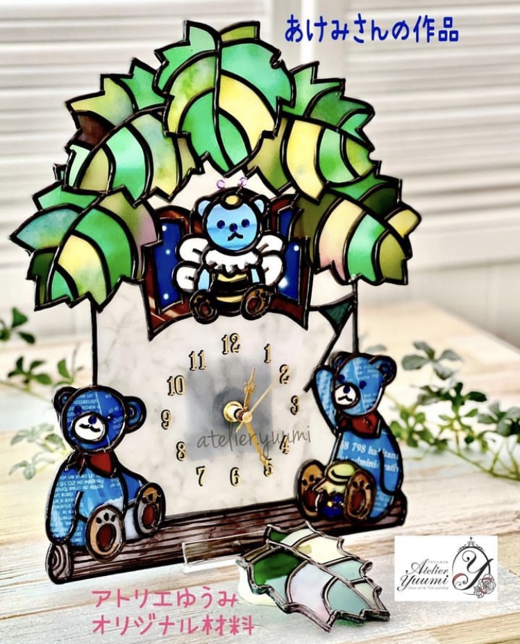 アトリエゆうみオリジナル材料で完成された生徒様のくまちゃんの時計です。グラスアートバージョンとトールペイントバージョンです。