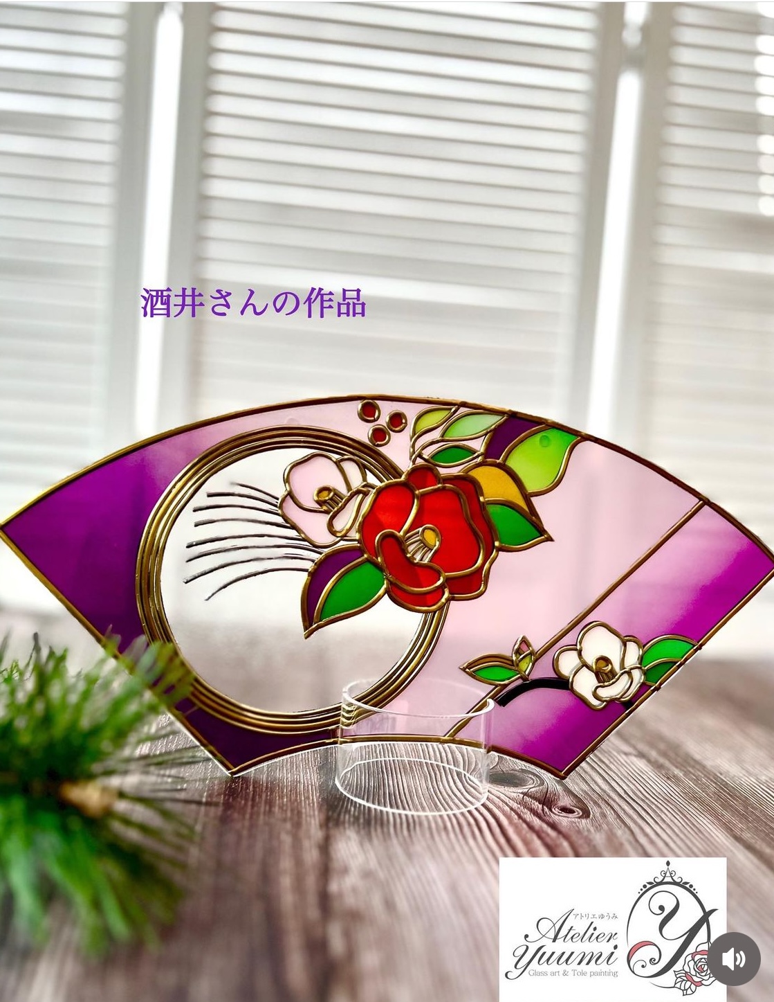 生徒様の作品でアクリル扇の椿のグラスアートです。素敵に完成されました。和テイストの作品は日本人にはとても馴染みがありますね。
