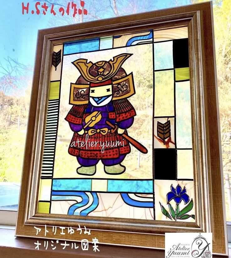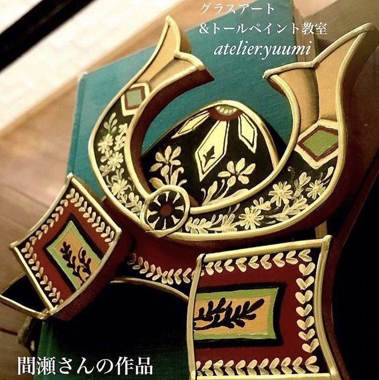 そして次の作品は、トールペイントとグラスアートで作った兜です。教室でとても人気の作品です。色々な技術をコラボして作れるのがアトリエゆうみの強みです。