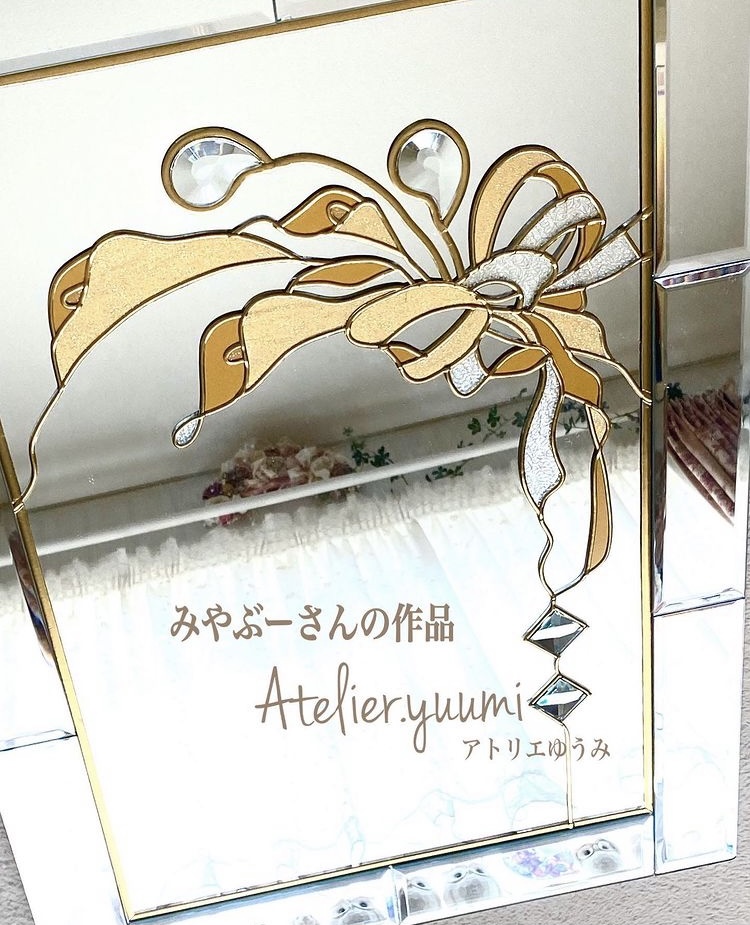 まずは、グラスアートの作品です。素敵なミラーです。図案は以前はカリキュラム(資格取得コース)でした。